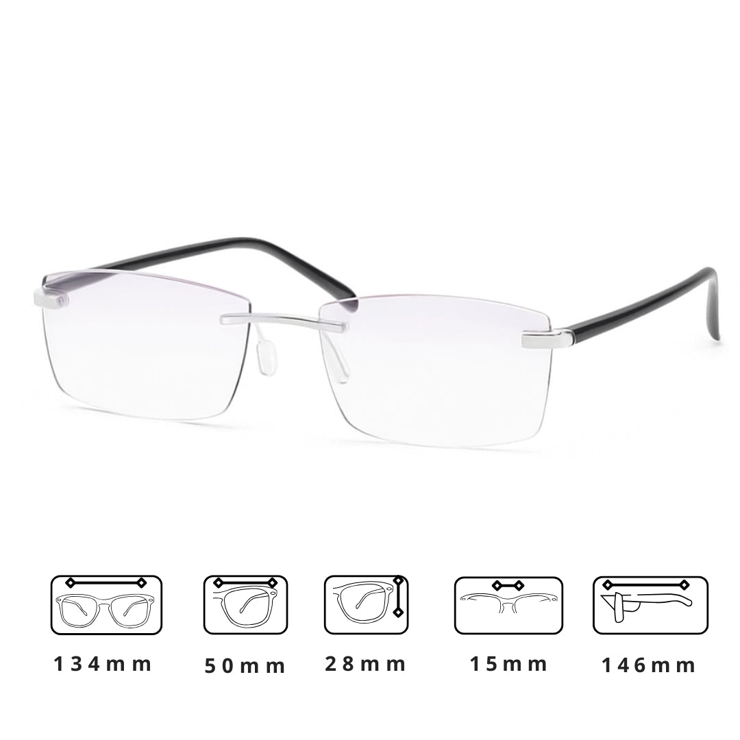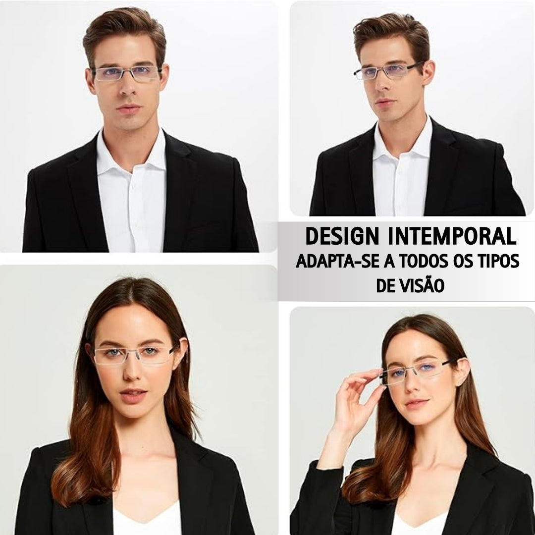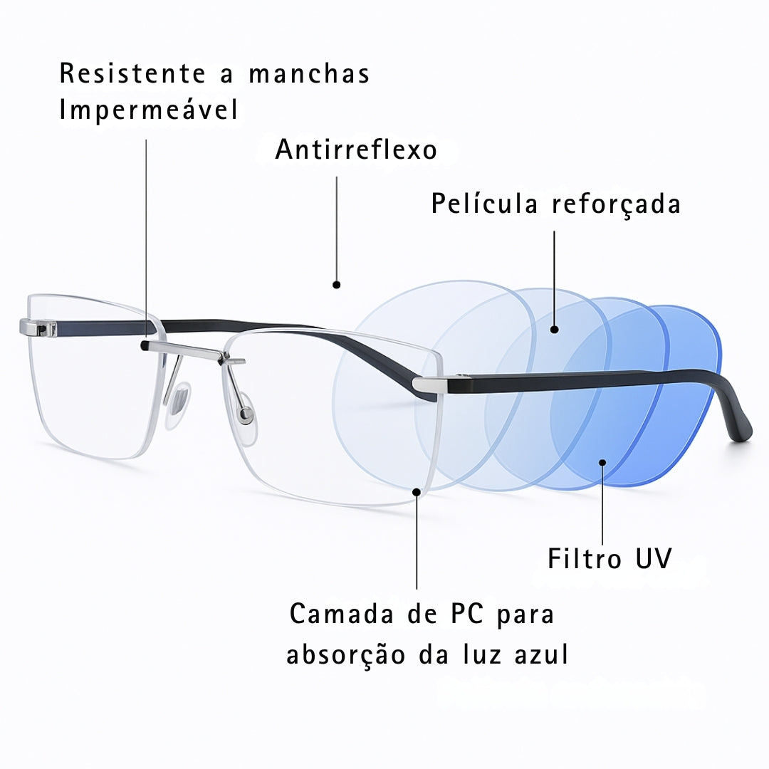 - Armação rimless em alumínio leve: design unissexo, confortável para todo o dia.