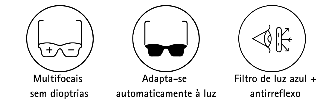 - Multifocais com ajuste automático: visão nítida a qualquer distância (perto, intermédia e longe).